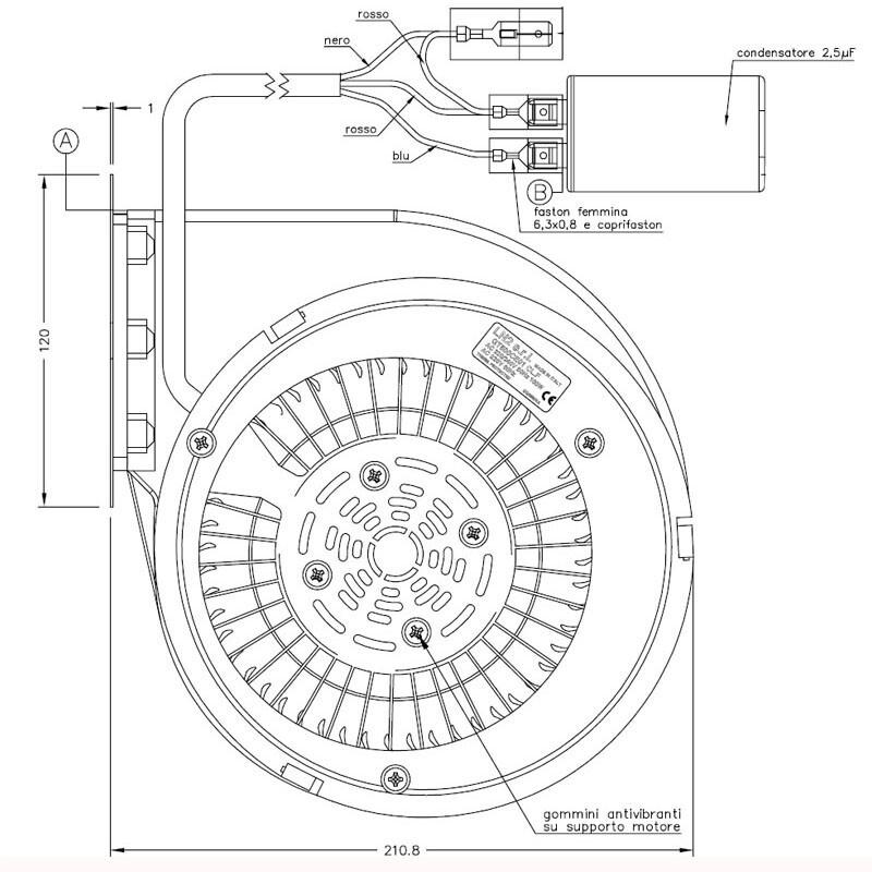 GT500CE01 - W935050011 centrifugal fan for pellet stoves. Specific for high temperatures, this fan is small and very reliable.